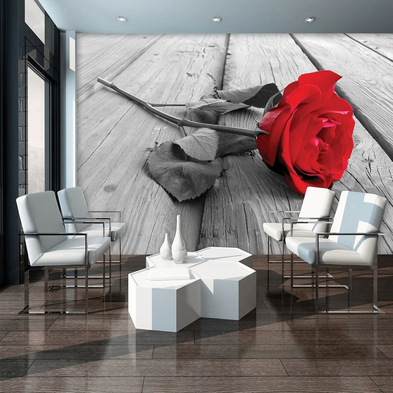 Baggrund og Design: Tapetet præsenterer et dramatisk sort-hvidt trægulv, der danner en kontrastfyldt baggrund til en strålende rød rose. Gulvet har detaljerede årer og knaster, der skaber en rustik og autentisk fornemmelse. Rosen, med sine levende røde blade, står i skarp kontrast til den monokrome baggrund, og bliver derved et blikfang, der symboliserer kærlighed og skønhed.